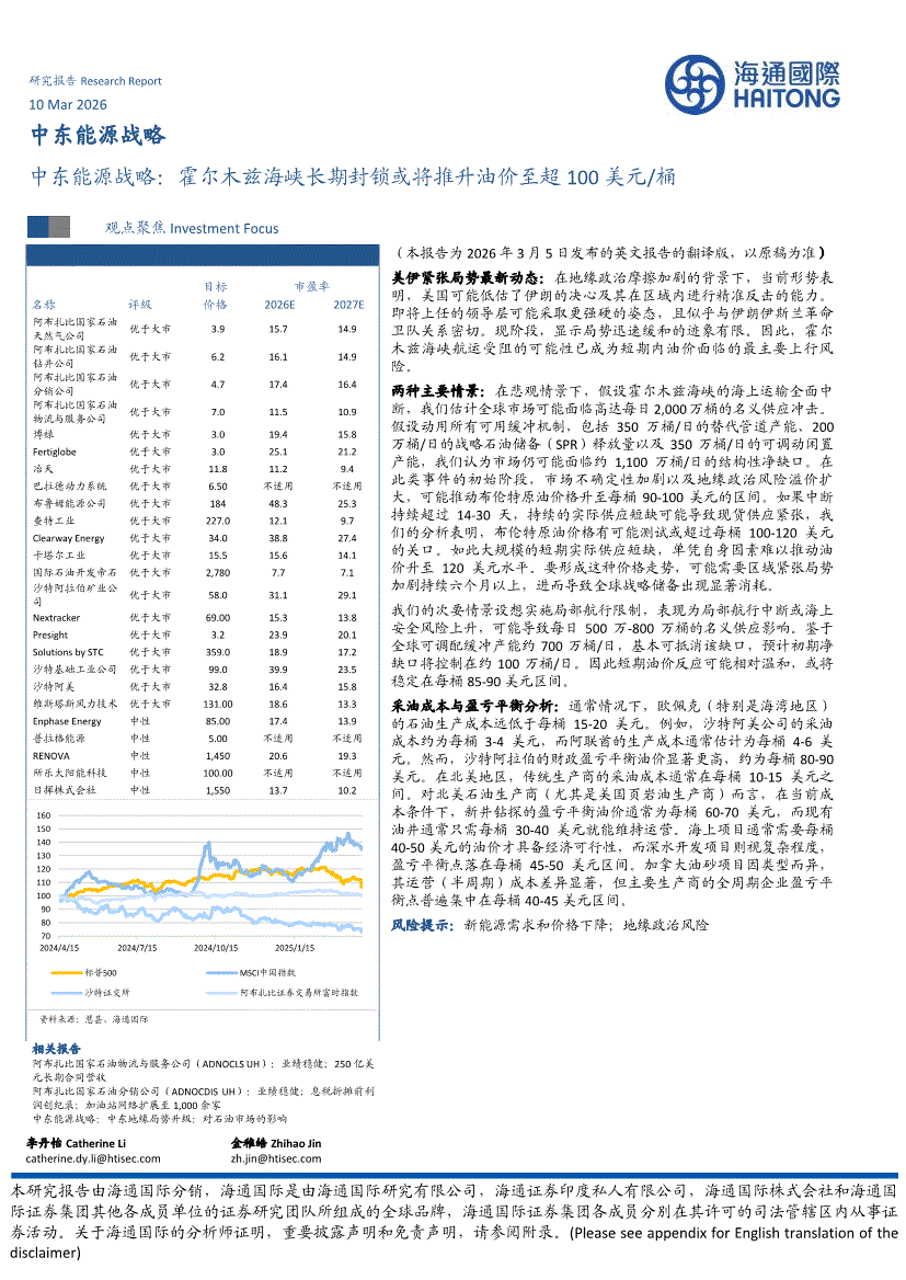 能源行业:海通国际-中东能源行业战略:霍尔木兹海峡长期封锁或将推升油价至超100美元/桶-260310
