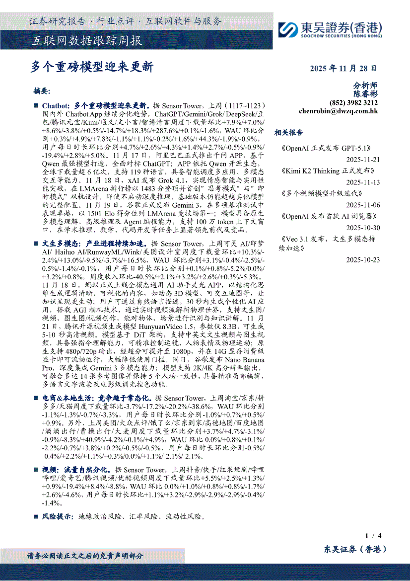 互联网行业:东吴证券(香港)-互联网行业数据跟踪周报:多个重磅模型迎来更新-251128