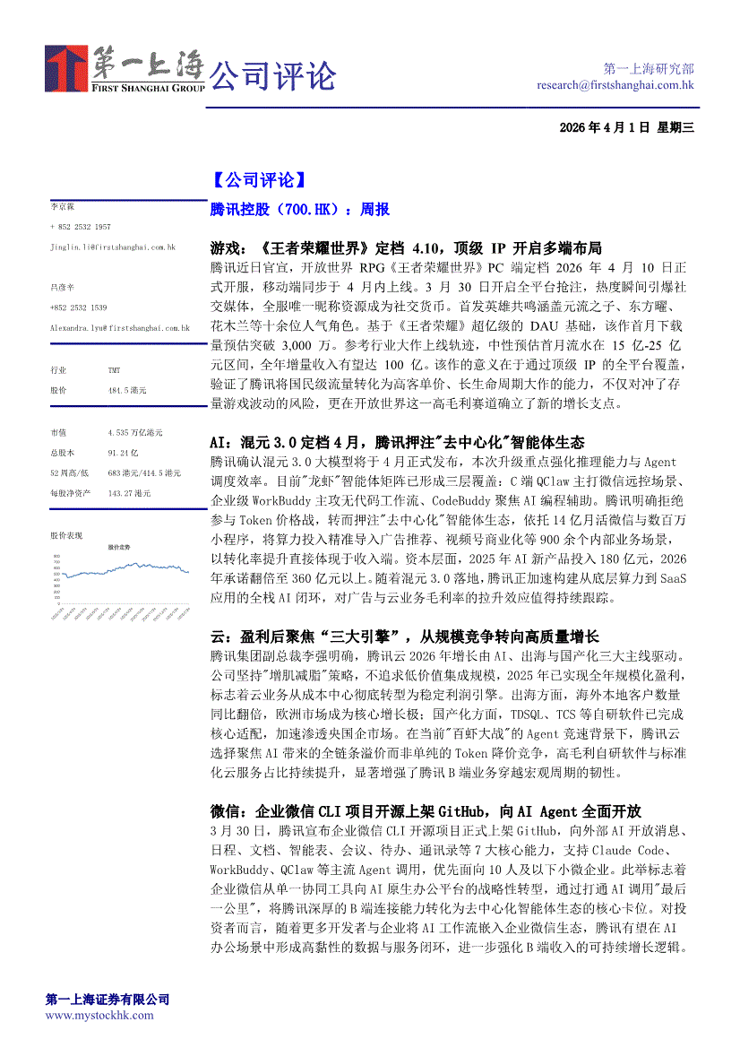 腾讯控股:第一上海-腾讯控股-0700.HK-周报-260401
