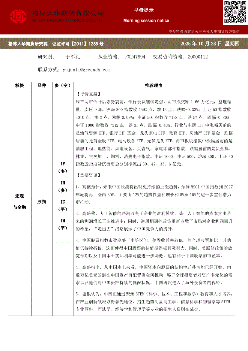 格林大华期货-一周简评:上证指数越过3900点,创10年新高-251010