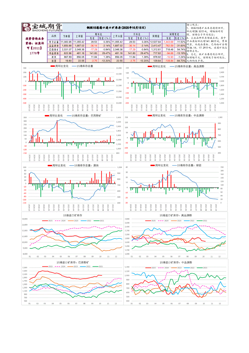 宝城期货-钢联15港铁矿石库存报告-251015