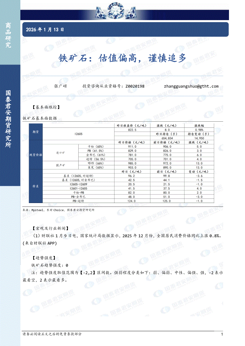 国泰君安期货-铁矿石:估值偏高,谨慎追多-260112