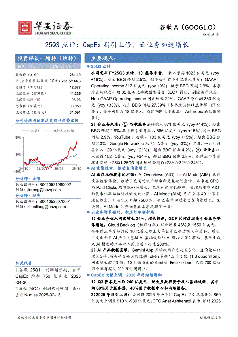 谷歌A:华安证券-谷歌A-GOOGL.US-25Q3点评:CapEx指引上修,云业务加速增长-251103