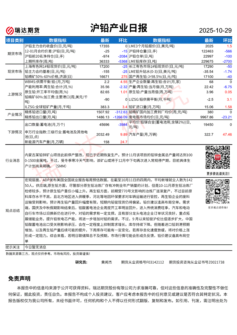 瑞达期货-沪铅产业日报-251029