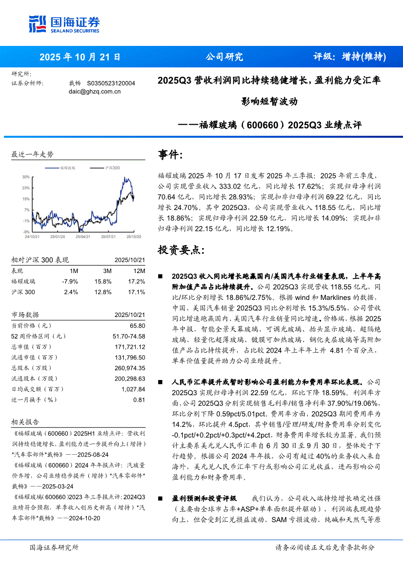 福耀玻璃:国海证券-福耀玻璃-600660-2025Q3业绩点评:2025Q3营收利润同比持续稳健增长,盈利能力受汇率影响短暂波动-251021
