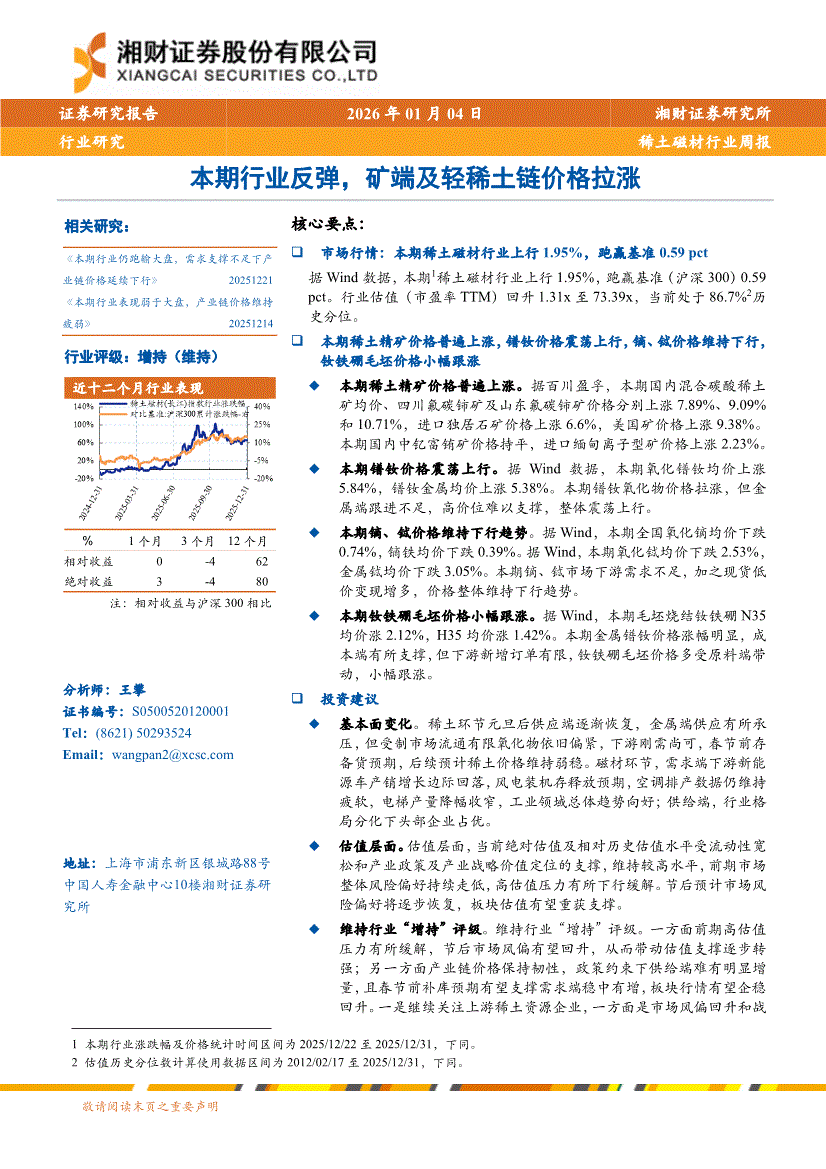 稀土磁材行业:湘财证券-稀土磁材行业周报:本期行业反弹,矿端及轻稀土链价格拉涨-260104