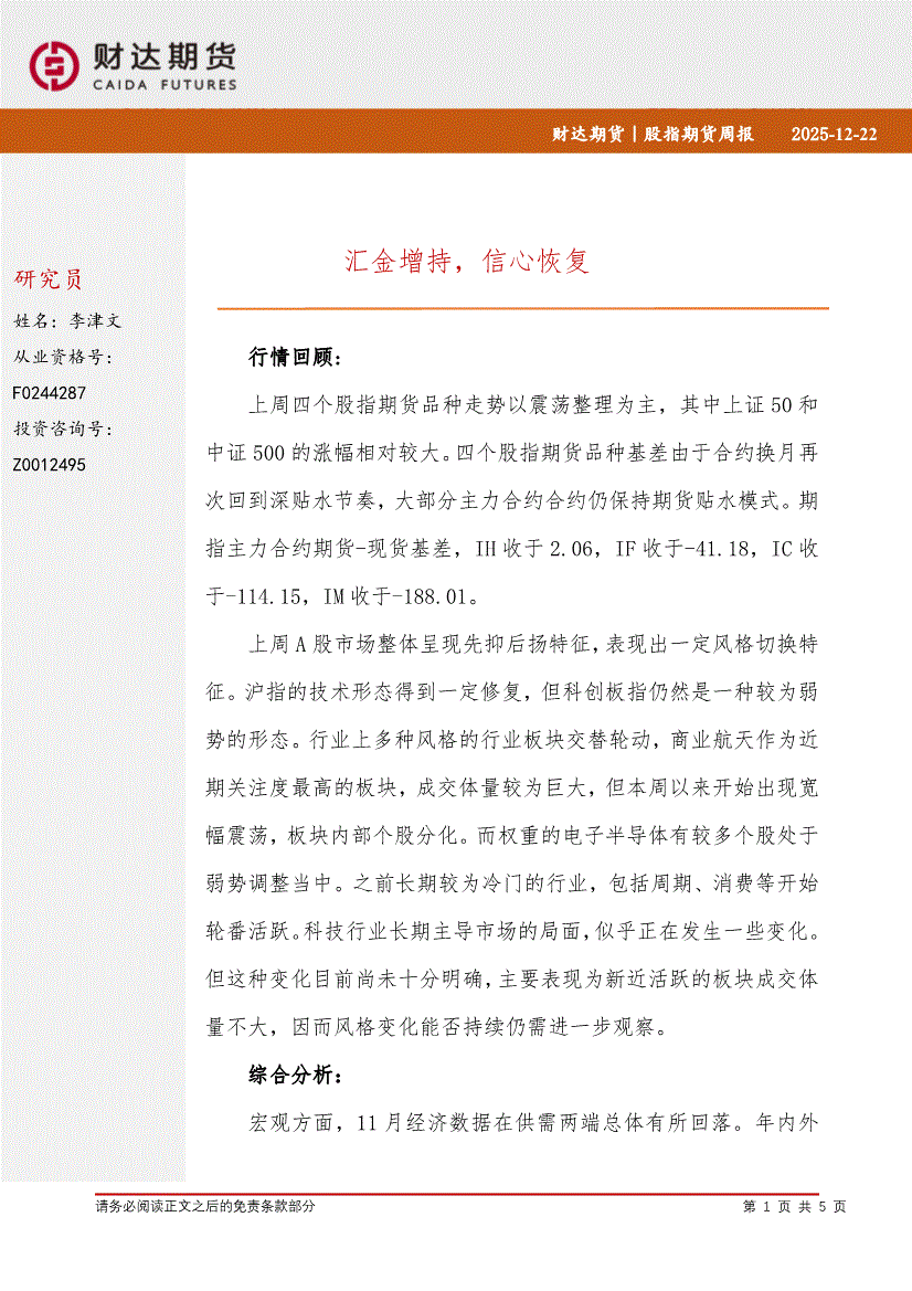 财达期货-股指期货周报:汇金增持,信心恢复-251222