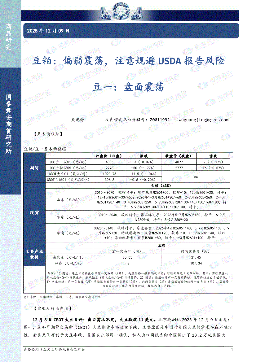国泰君安期货-豆粕:偏弱震荡,注意规避USDA报告风险,豆一,盘面震荡-251209