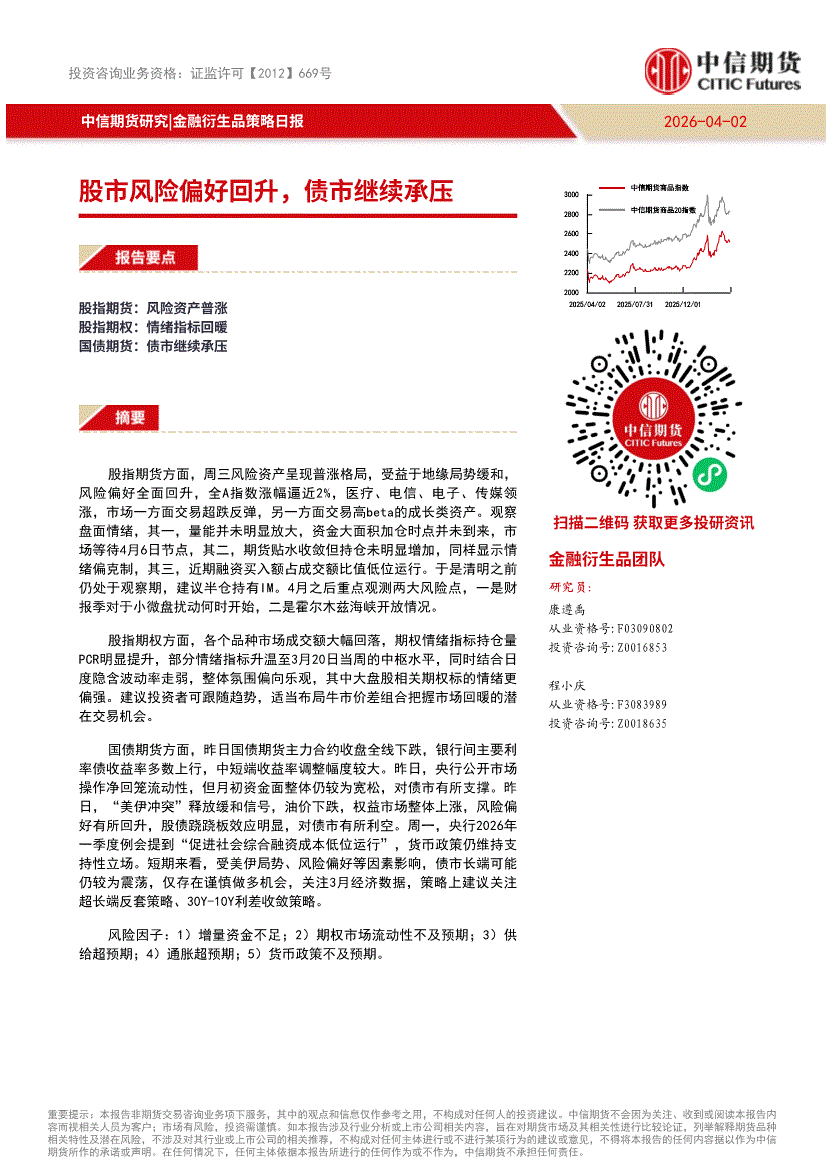 中信期货-金融衍生品策略日报:股市风险偏好回升,债市继续承压-260402