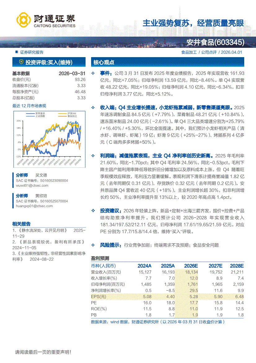 安井食品:财通证券-安井食品-603345-主业强势复苏,经营质量亮眼-260401