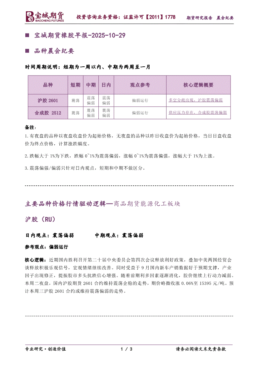宝城期货-橡胶甲醇原油日报:偏多情绪减弱,能化震荡偏弱-251028