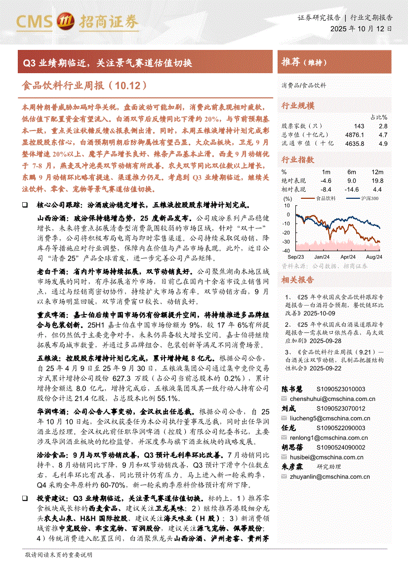 食品饮料行业:招商证券-食品饮料行业周报:Q3业绩期临近,关注景气赛道估值切换-251012