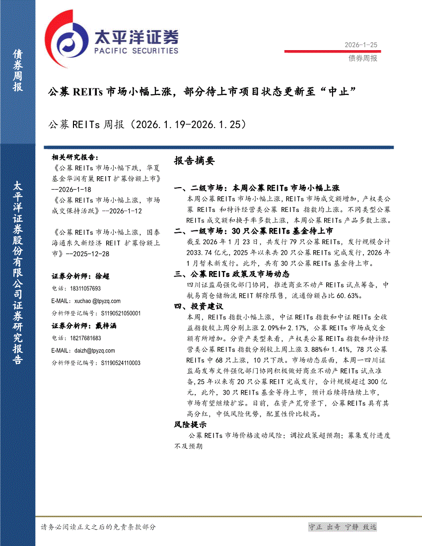 太平洋证券-公募REITs周报:公募REITs市场小幅上涨,部分待上市项目状态更新至“中止”-260125