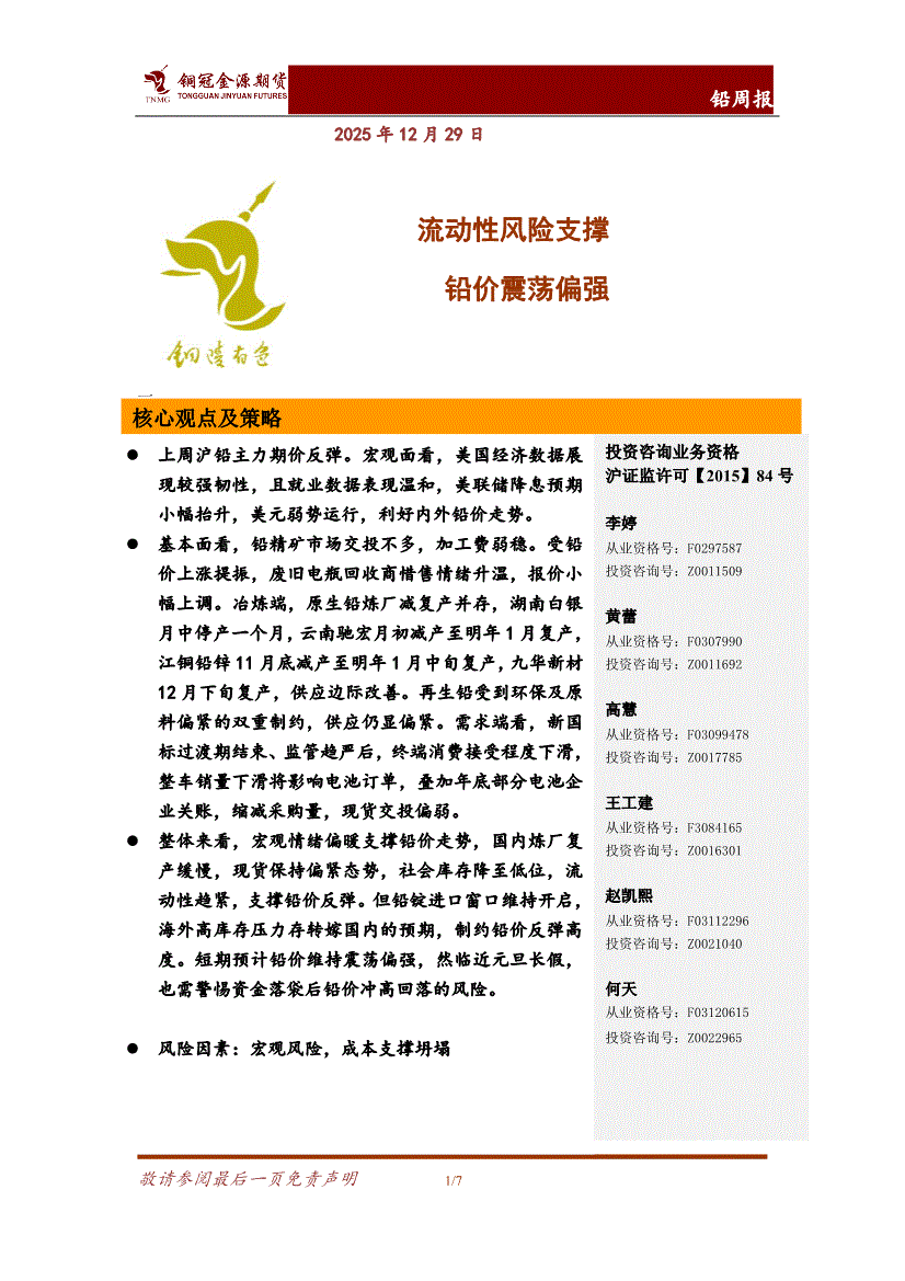 铜冠金源期货-铅周报:流动性风险支撑,铅价震荡偏强-251229