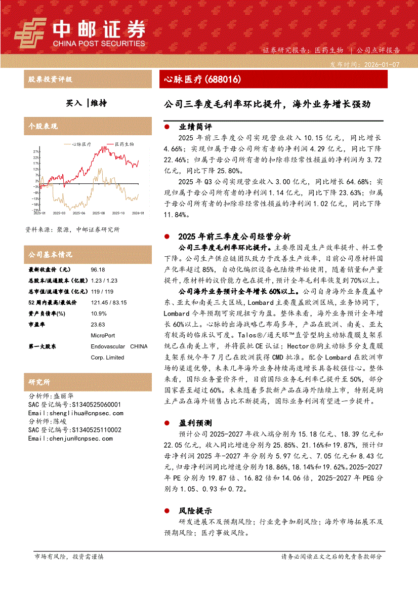 心脉医疗:中邮证券-心脉医疗-688016-公司三季度毛利率环比提升,海外业务增长强劲-260107