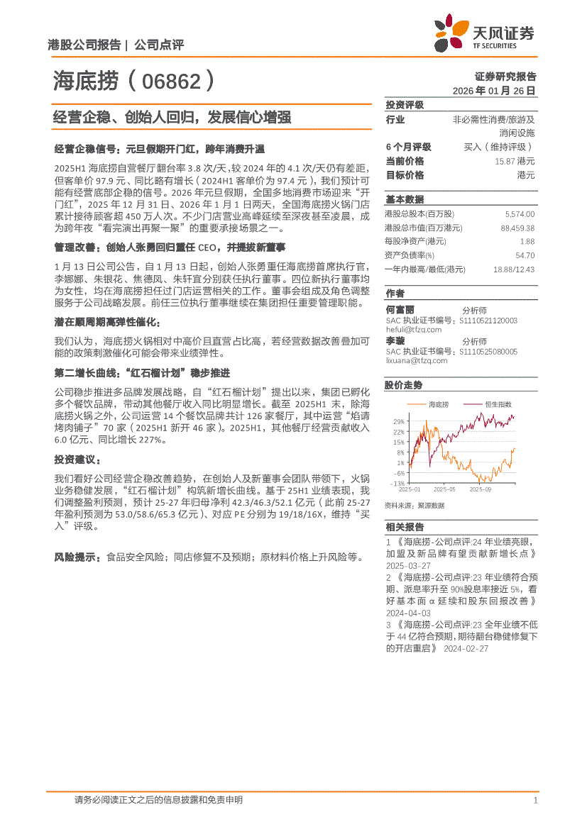 海底捞:天风证券-海底捞-6862.HK-经营企稳、创始人回归,发展信心增强-260126