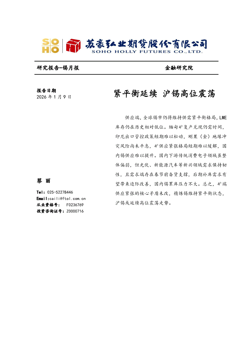 弘业期货-锡月报:紧平衡延续,沪锡高位震荡-260109