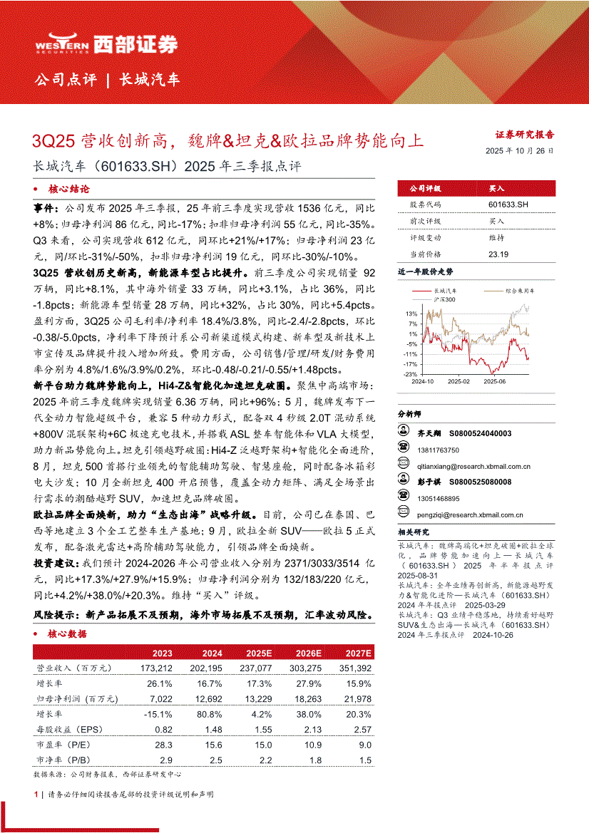 长城汽车:西部证券-长城汽车-601633-2025年三季报点评:3Q25营收创新高,魏牌&坦克&欧拉品牌势能向上-251026
