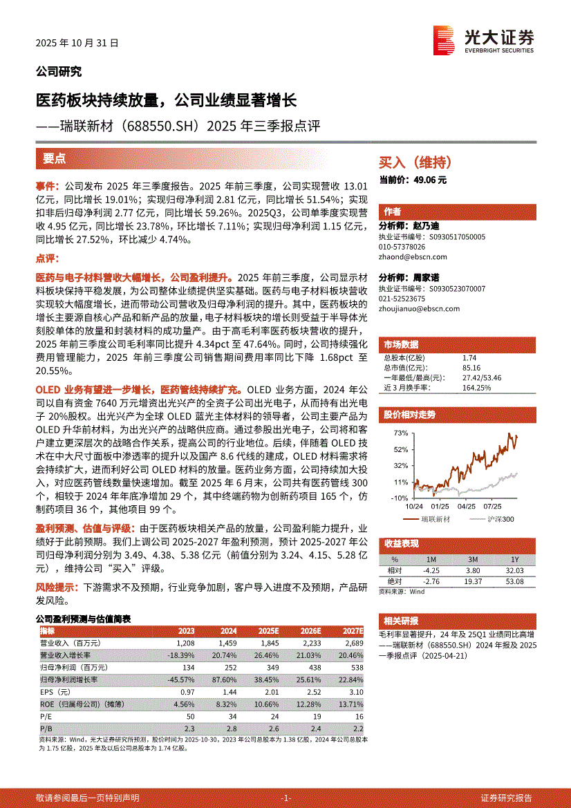 瑞联新材:光大证券-瑞联新材-688550-2025年三季报点评:医药板块持续放量,公司业绩显著增长-251031