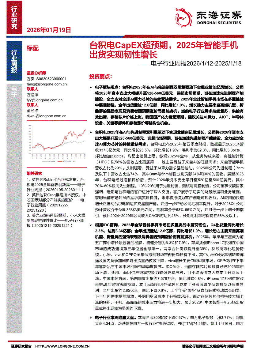电子行业:东海证券-电子行业周报:台积电CapEX超预期,2025年智能手机出货实现韧性增长-260119