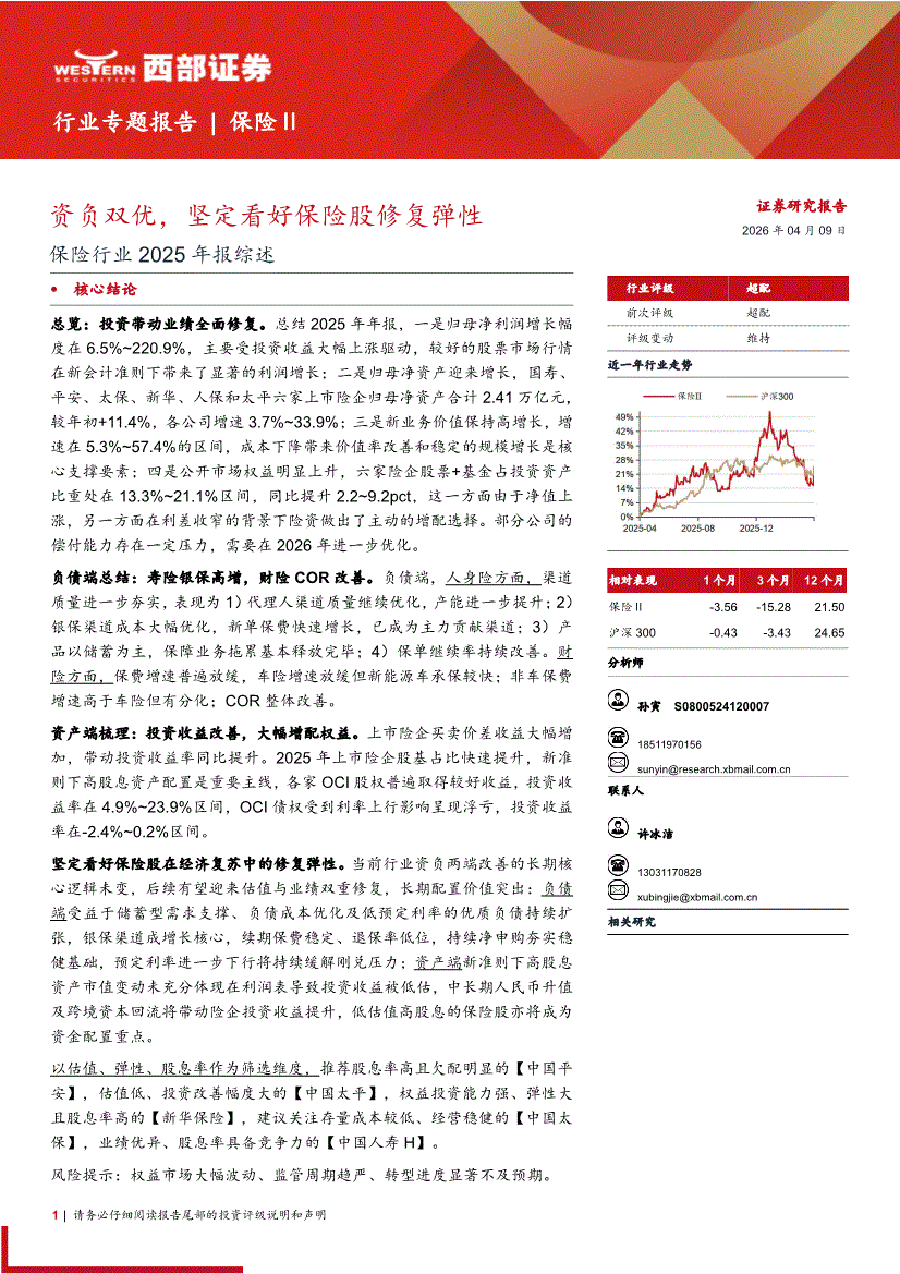 保险行业:西部证券-保险行业2025年报综述:资负双优,坚定看好保险股修复弹性-260409