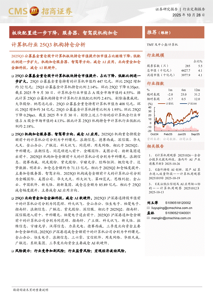 计算机行业:招商证券-计算机行业25Q3机构持仓分析:板块配置进一步下降,服务器、智驾获机构加仓-251028