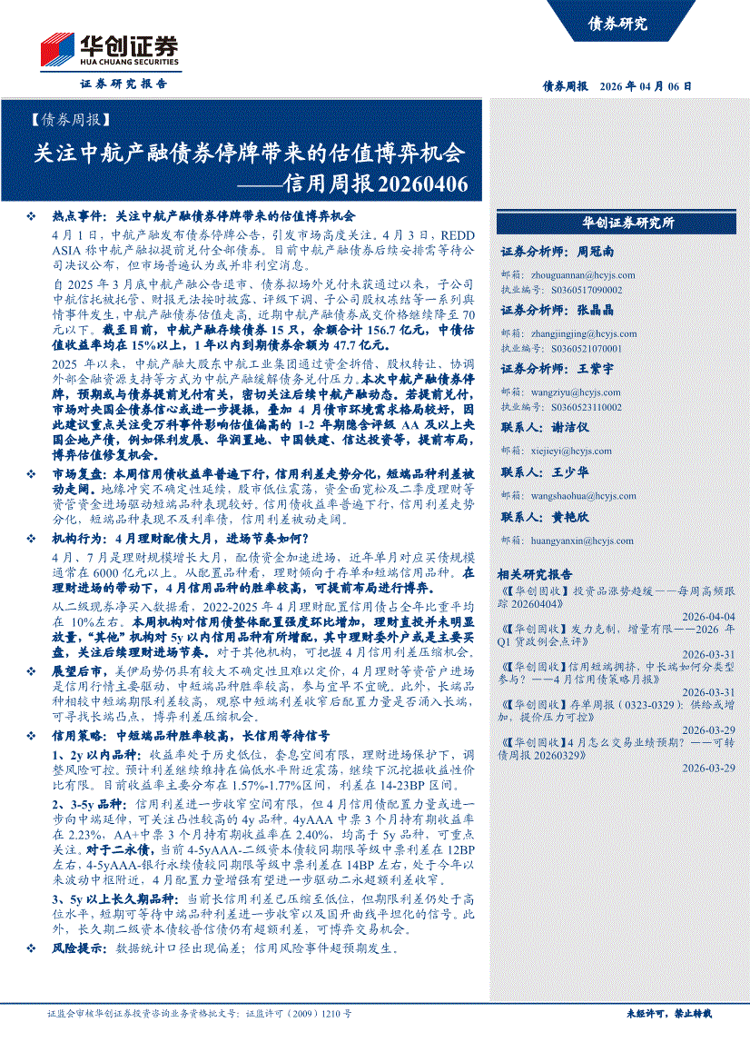 华创证券-【债券周报】信用周报:关注中航产融债券停牌带来的估值博弈机会-260406