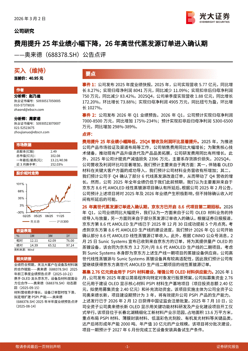 奥来德:光大证券-奥来德-688378-公告点评:费用提升25年业绩小幅下降,26年高世代蒸发源订单进入确认期-260302