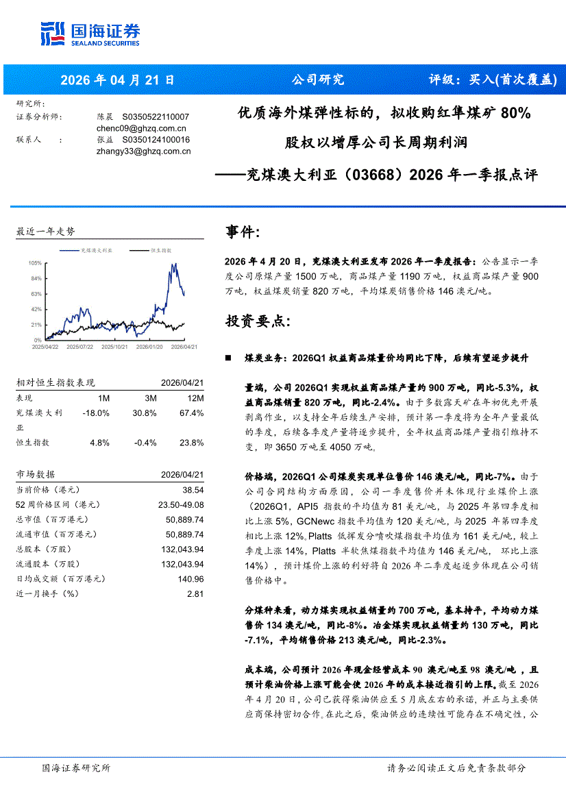 兖煤澳大利亚:国海证券-兖煤澳大利亚-3668.HK-2026年一季报点评:优质海外煤弹性标的,拟收购红隼煤矿80%股权以增厚公司长周期利润-260421