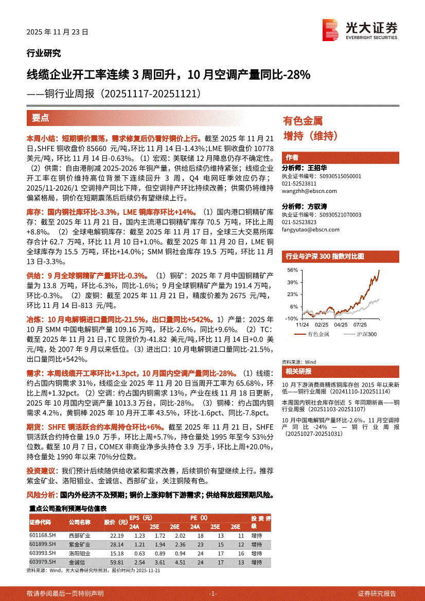 铜行业:光大证券-铜行业周报:线缆企业开工率连续3周回升,10月空调产量同比负28%-251123