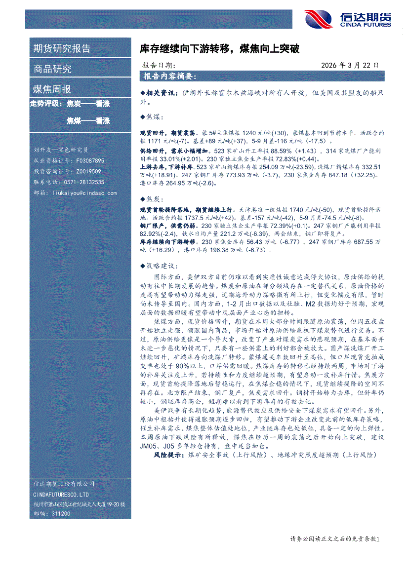 信达期货-煤焦周报:库存继续向下游转移,煤焦向上突破-260322