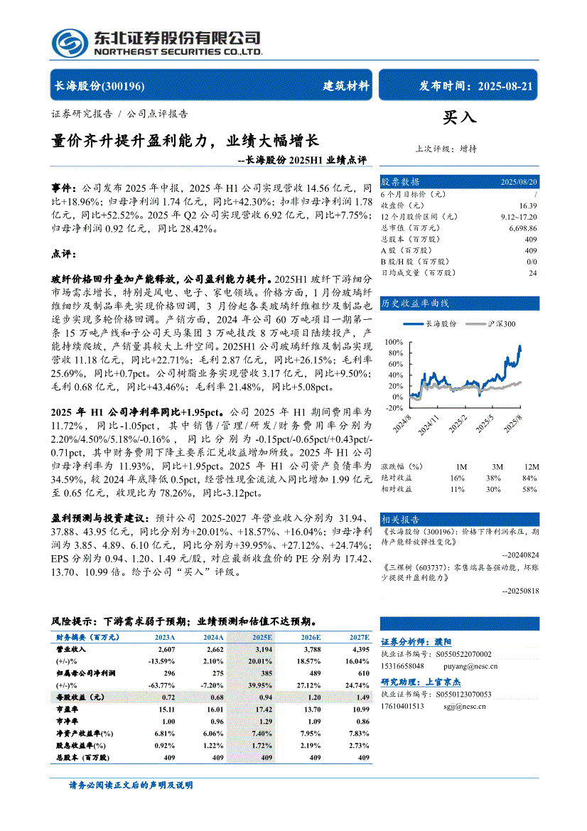 长海股份:东北证券-长海股份-300196-2025H1业绩点评:量价齐升提升盈利能力,业绩大幅增长-250821