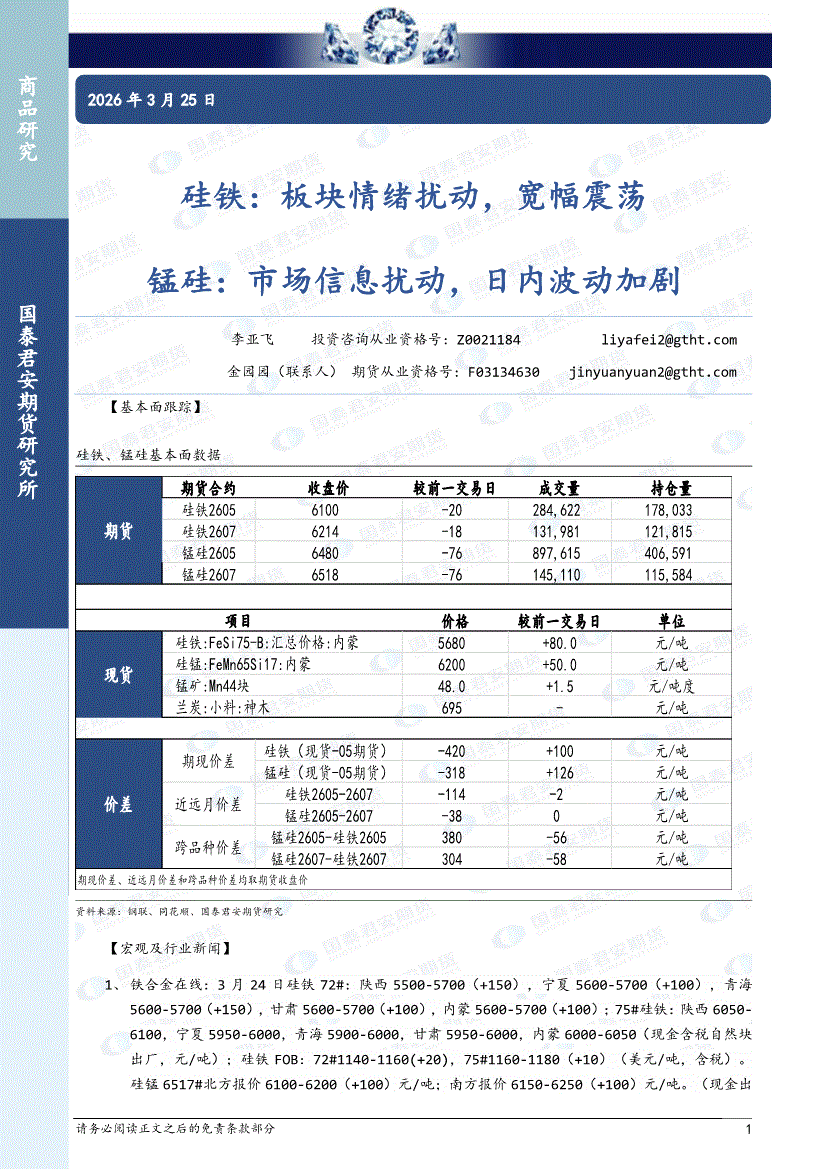 国泰君安期货-硅铁:板块情绪扰动,宽幅震荡,锰硅,市场信息扰动,日内波动加剧-260325