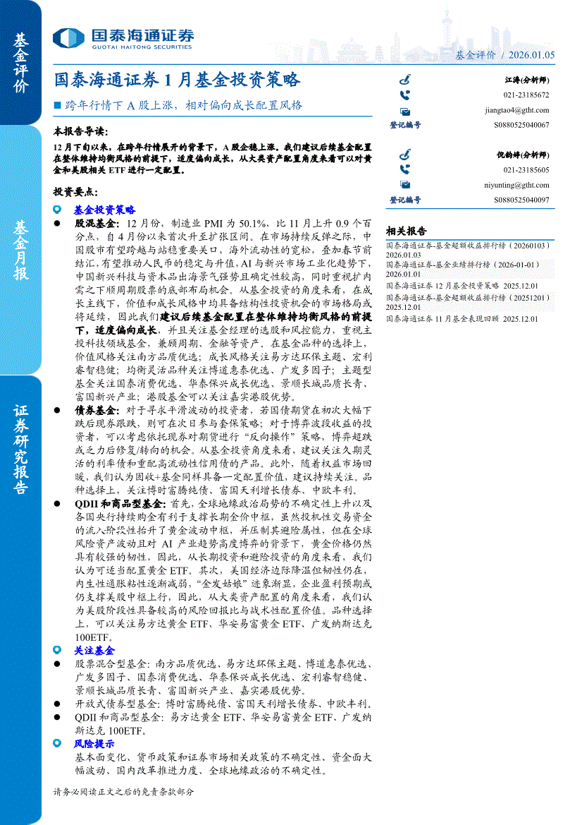 国泰海通证券-1月基金投资策略:跨年行情下A股上涨,相对偏向成长配置风格-260105