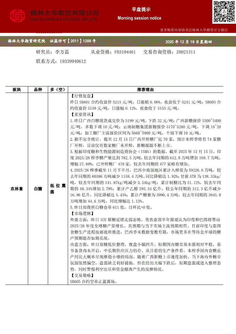 格林大华期货-早盘提示:白糖红枣橡胶-251218