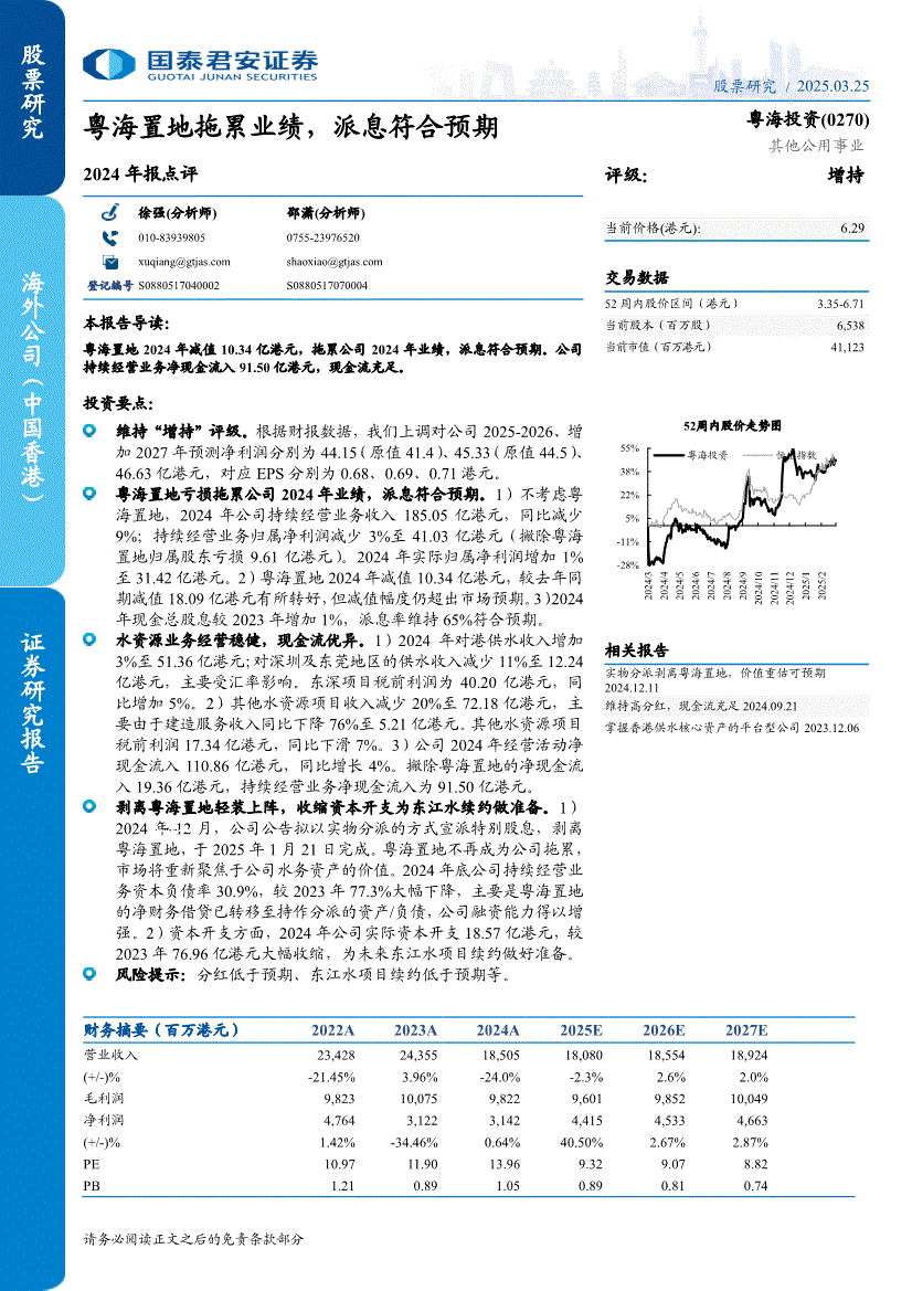粤海投资:国泰君安-粤海投资-0270.HK-2024年报点评:粤海置地拖累业绩,派息符合预期-250325