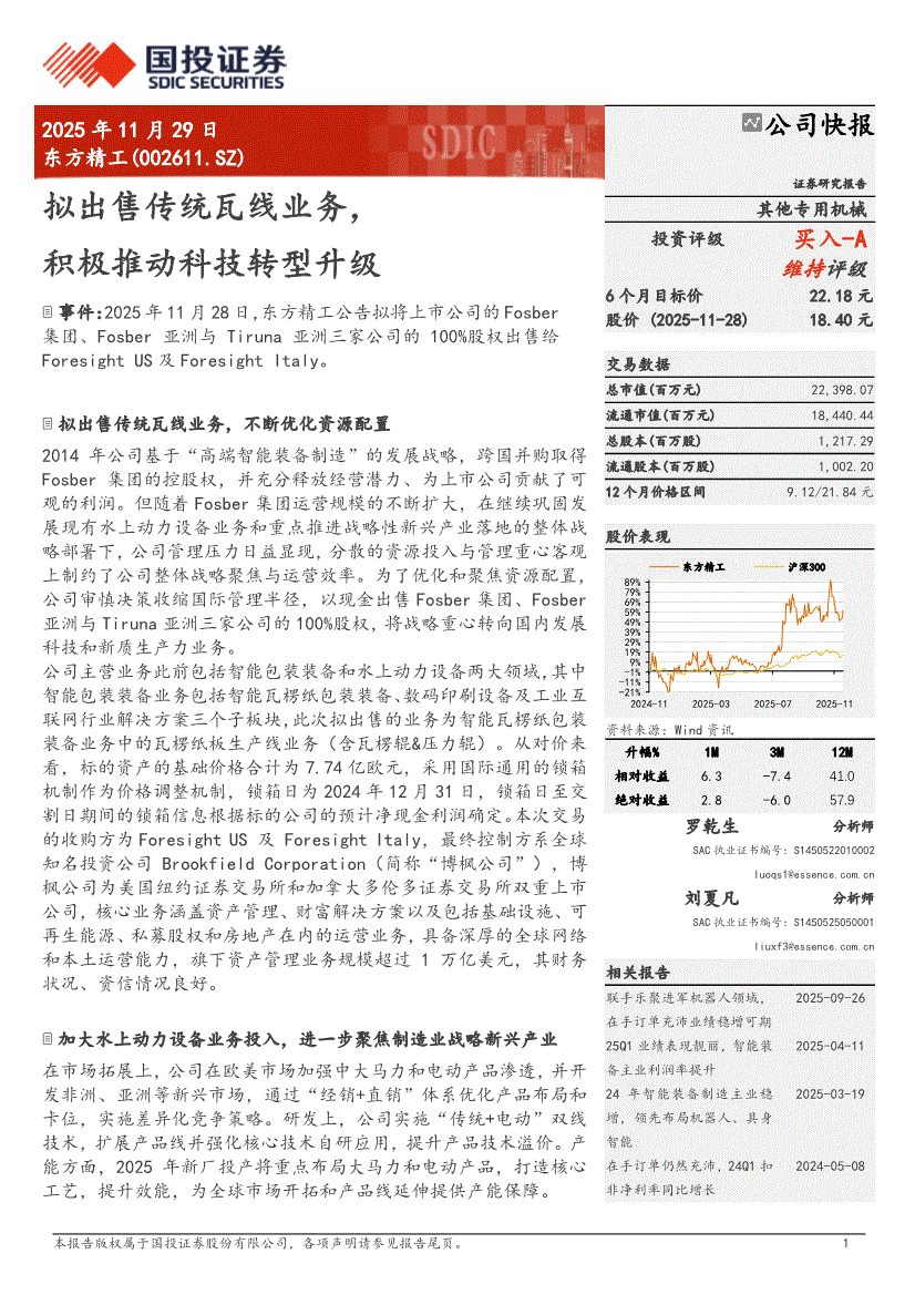 东方精工:国投证券-东方精工-002611-拟出售传统瓦线业务,积极推动科技转型升级-251129
