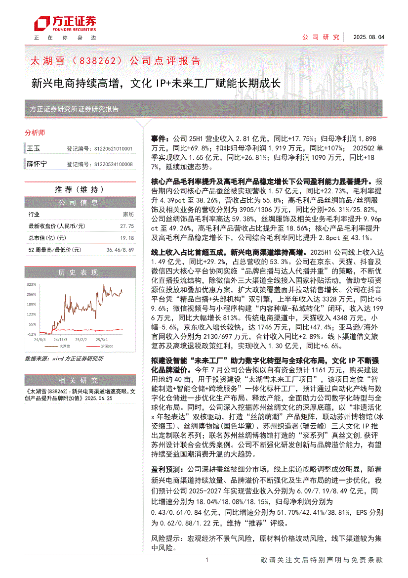 太湖雪:方正证券-太湖雪-920262-公司点评报告:新兴电商持续高增,文化IP+未来工厂赋能长期成长-250804