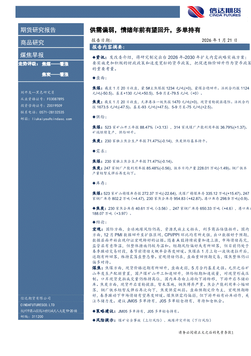 信达期货-煤焦早报:供需偏弱,情绪年前有望回升,多单持有-260121