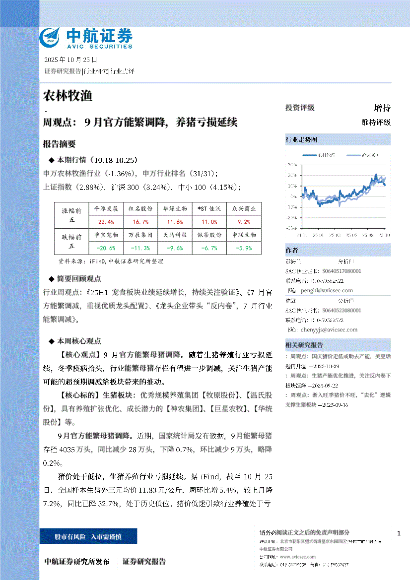 农林牧渔行业:中航证券-农林牧渔行业周观点: 9月官方能繁调降,养猪亏损延续-251025