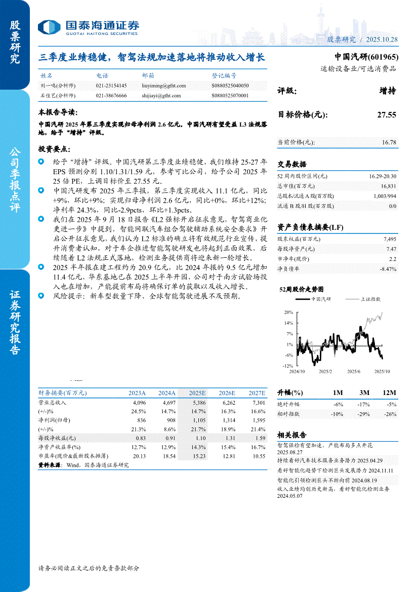 中国汽研:国泰海通证券-中国汽研-601965-三季度业绩稳健,智驾法规加速落地将推动收入增长-251028