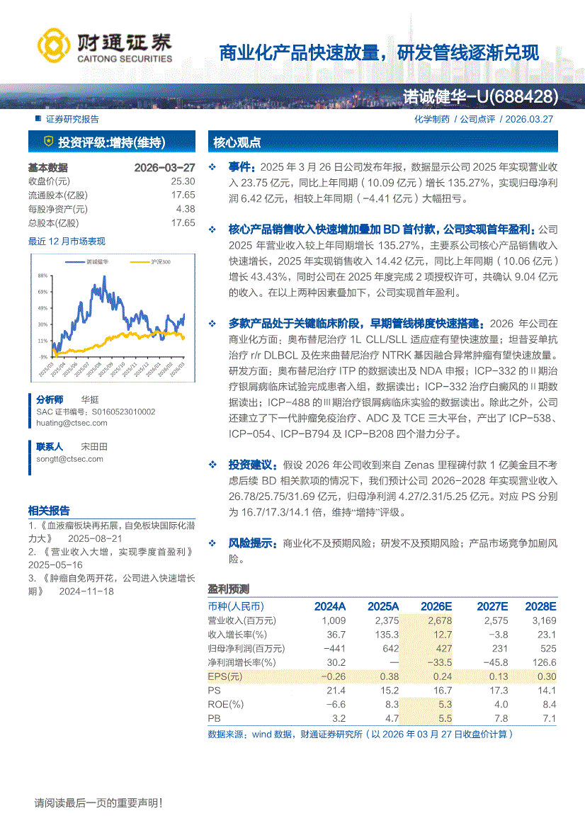 诺诚健华:财通证券-诺诚健华-688428-商业化产品快速放量,研发管线逐渐兑现-260327