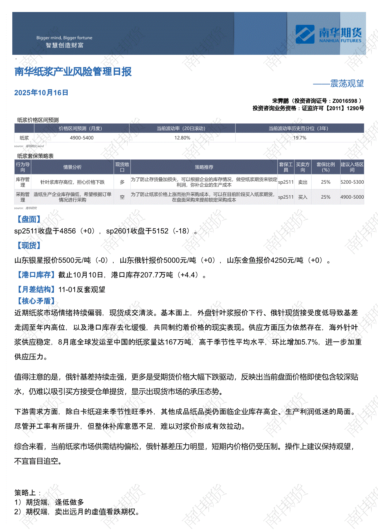 南华期货-纸浆产业风险管理日报:震荡观望-251016