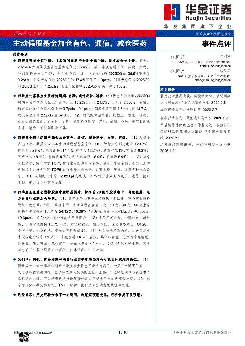 华金证券-主动偏股基金加仓有色、通信,减仓医药-260212