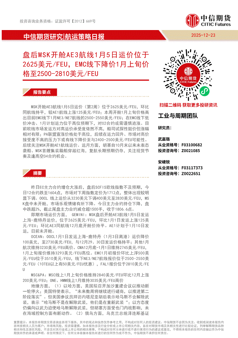 中信期货-航运策略日报:盘后MSK开舱AE3航线1月5日运价位于2625美元/FEU,EMC线下降价1月上旬价格至2500~2810美元/FEU-251223