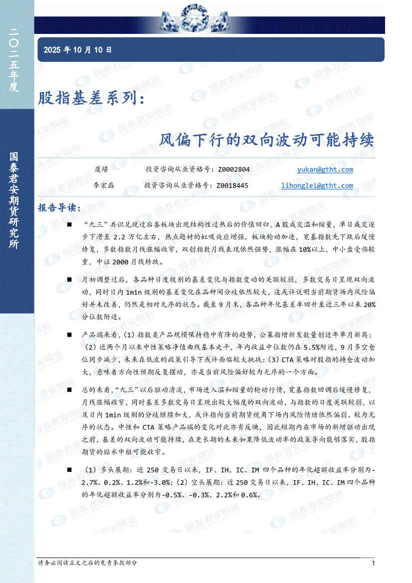 国泰君安期货-股指基差系列:风偏下行的双向波动可能持续-251010