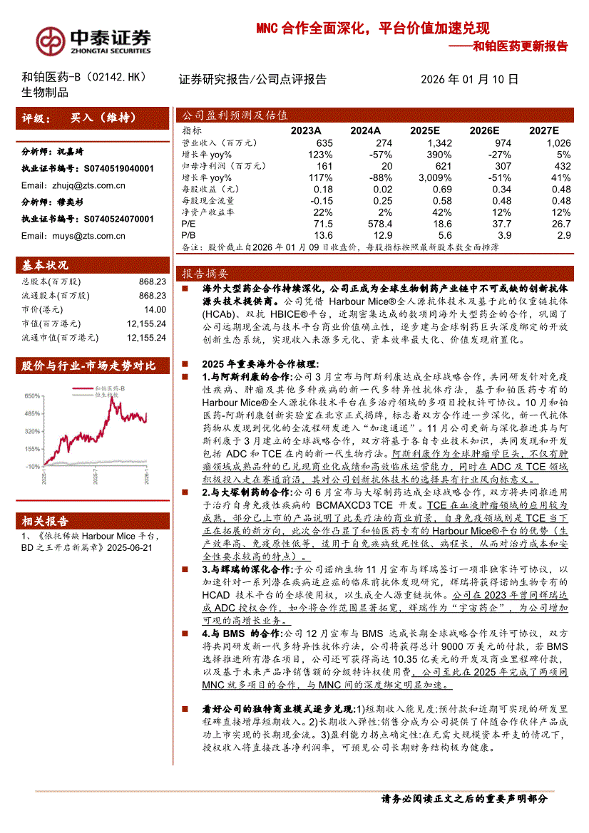 和铂医药~B:中泰证券-和铂医药~B-2142.HK-更新报告:MNC合作全面深化,平台价值加速兑现-260110
