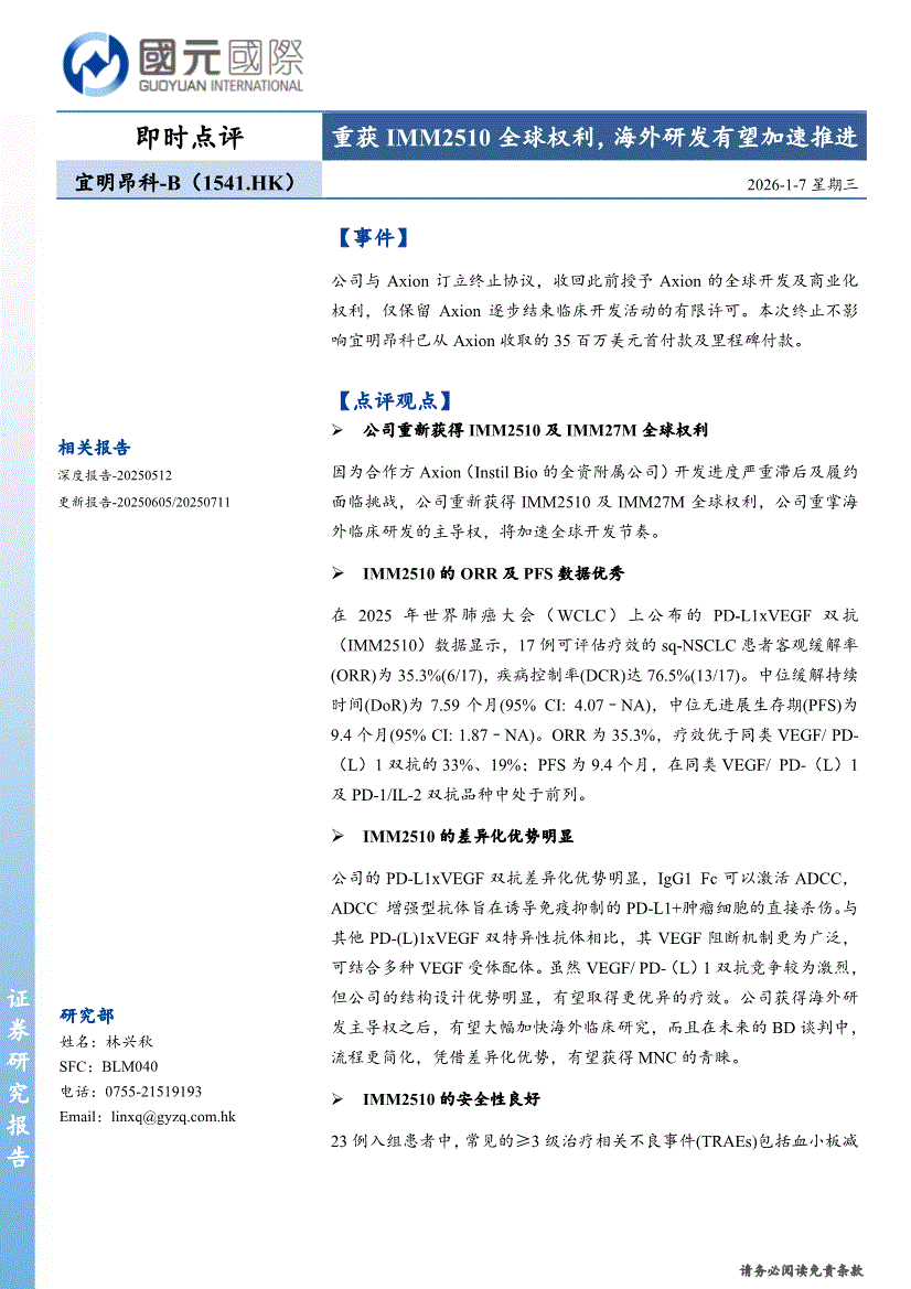 宜明昂科~B:国元国际-宜明昂科~B-1541.HK-重获IMM2510全球权利,海外研发有望加速推进-260107