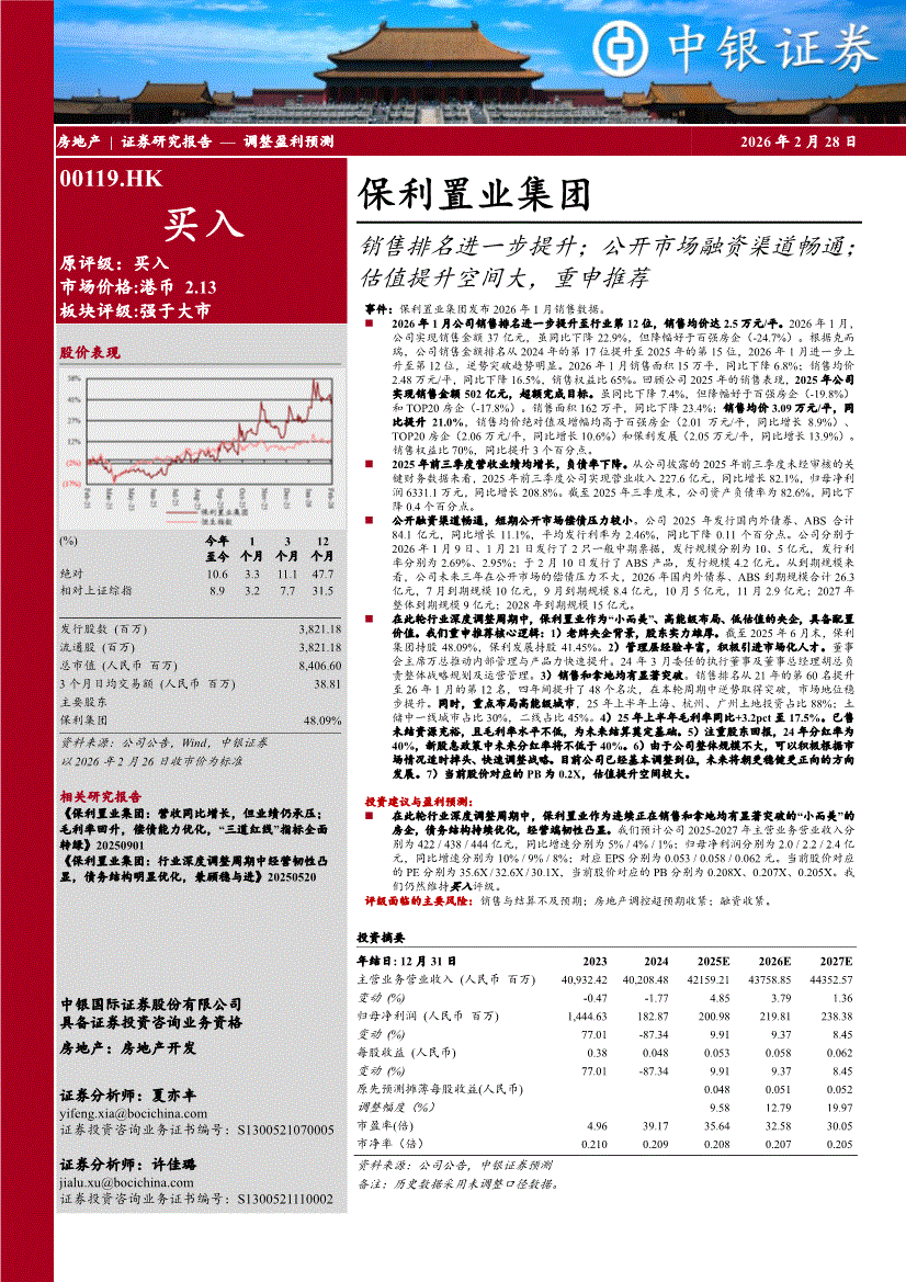 保利置业集团:中银国际-保利置业集团-0119.HK-销售排名进一步提升;公开市场融资渠道畅通;估值提升空间大,重申推荐-260228
