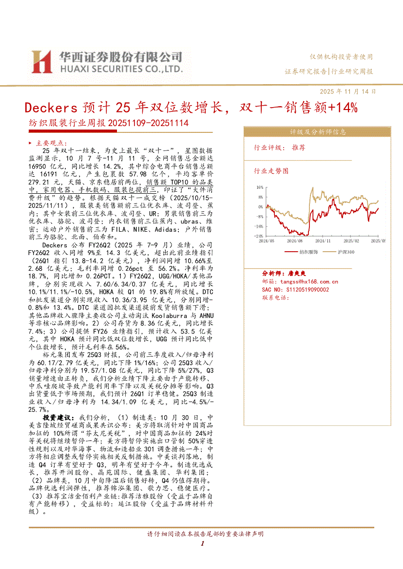 纺织服装行业:华西证券-纺织服装行业周报:Deckers预计25年双位数增长,双十一销售额+14%-251114
